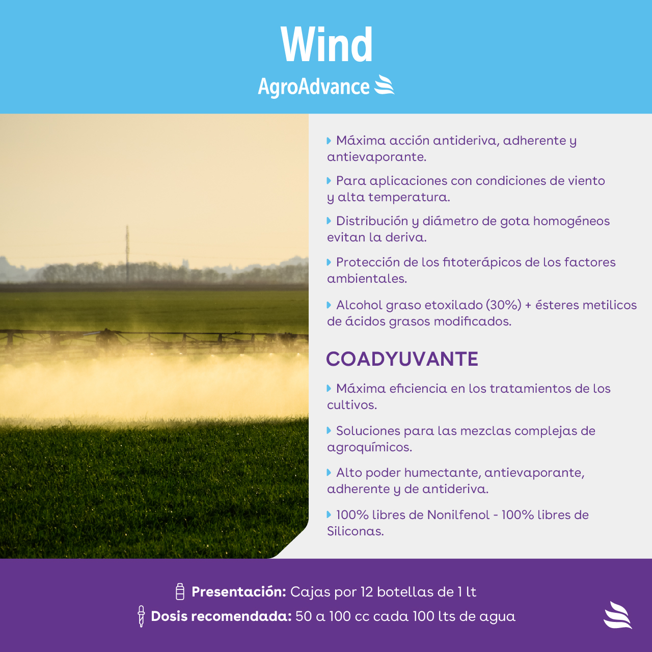 WIND se recomienda para lograr una fumigación homogénea en la distribución y diámetro de la gota, a la vez que le permite cubrir totalmente el canopeo en condiciones de viento, evitando su dispersión a zonas no deseadas, sin necesidad de aumentar la presión del asperjado.