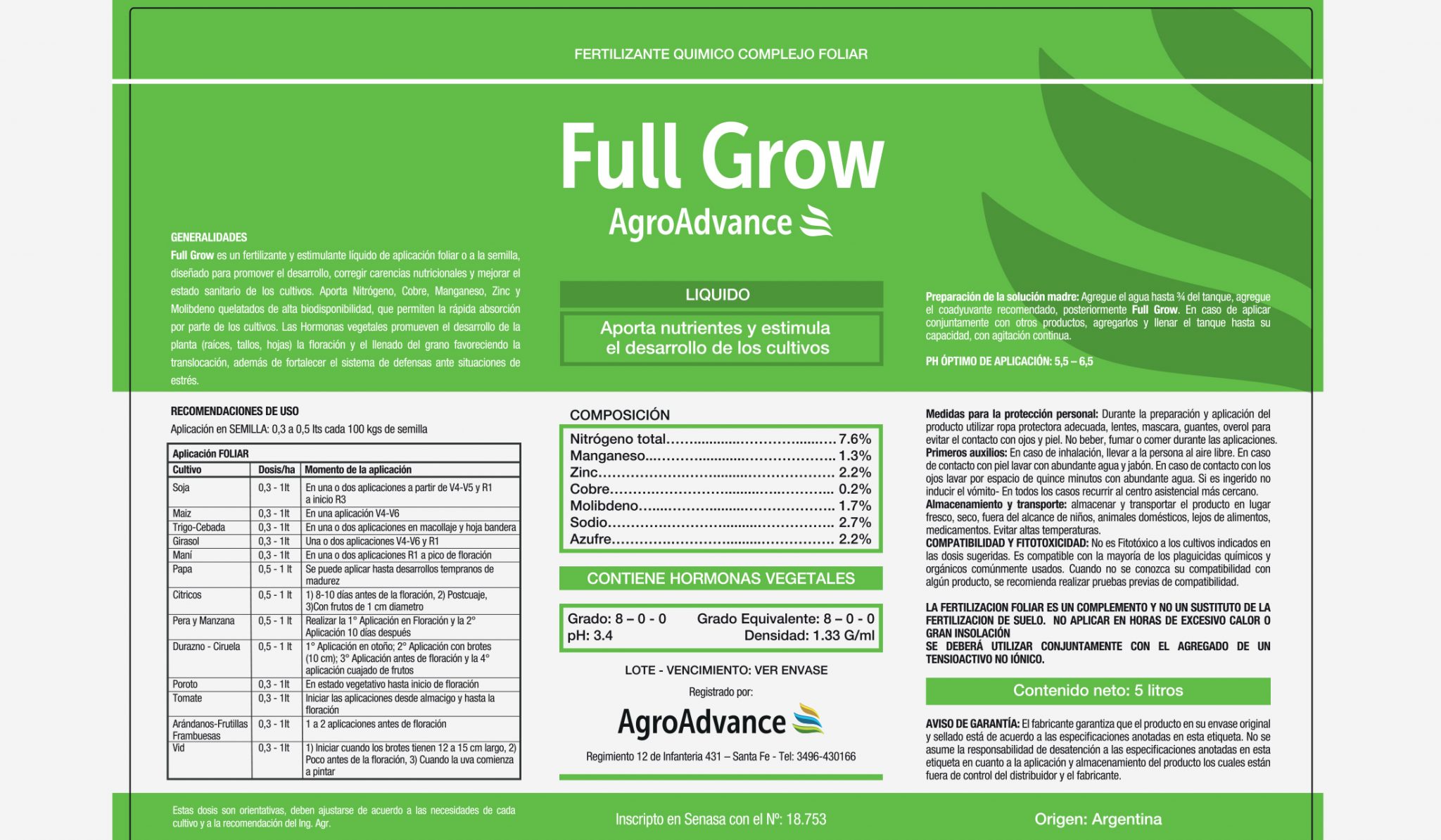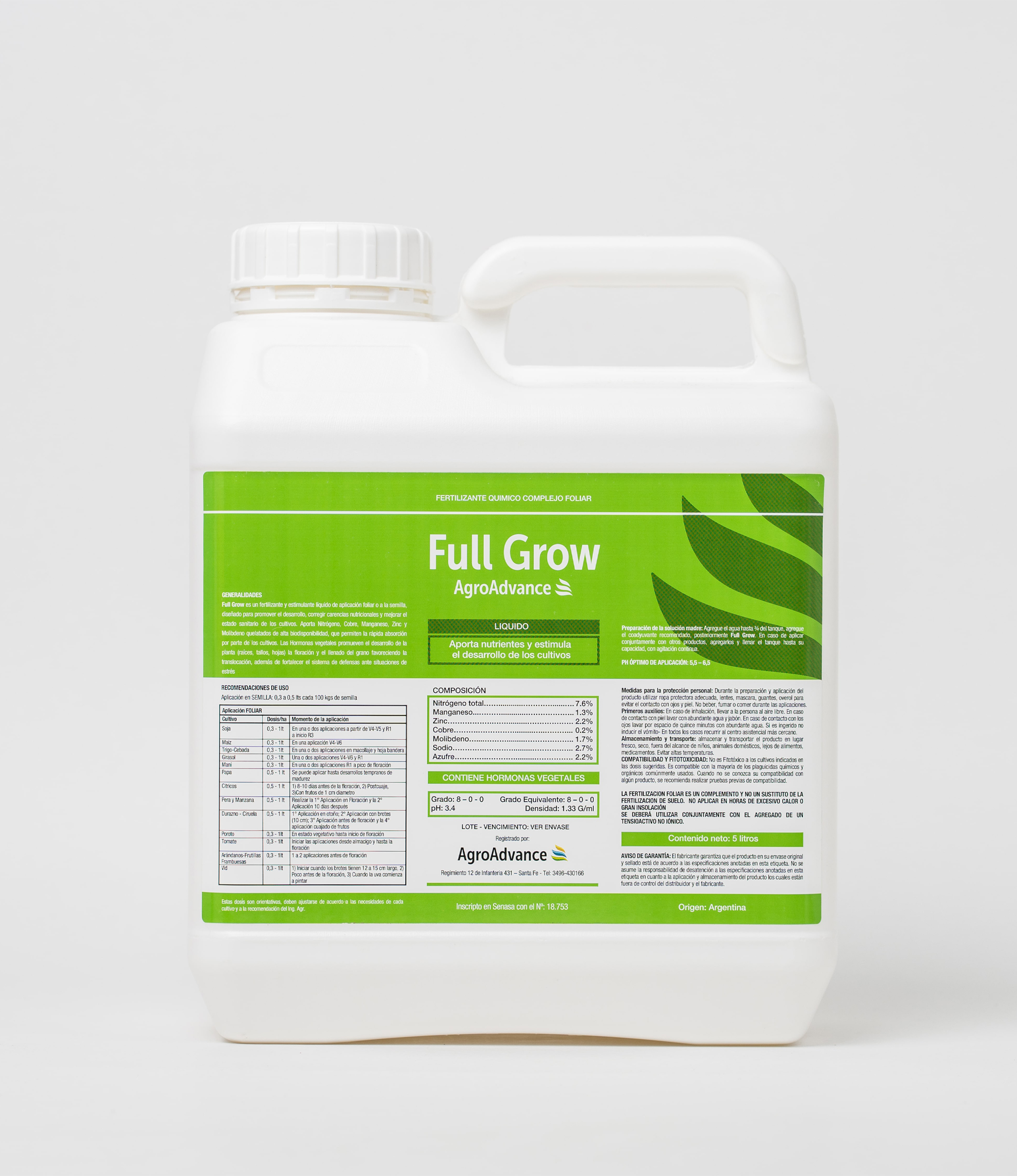 Full Grow es un fertilizante y fito estimulante líquido de aplicación foliar o a la semilla, diseñado para promover el desarrollo, corregir carencias nutricionales y mejorar el estado sanitario de los cultivos.