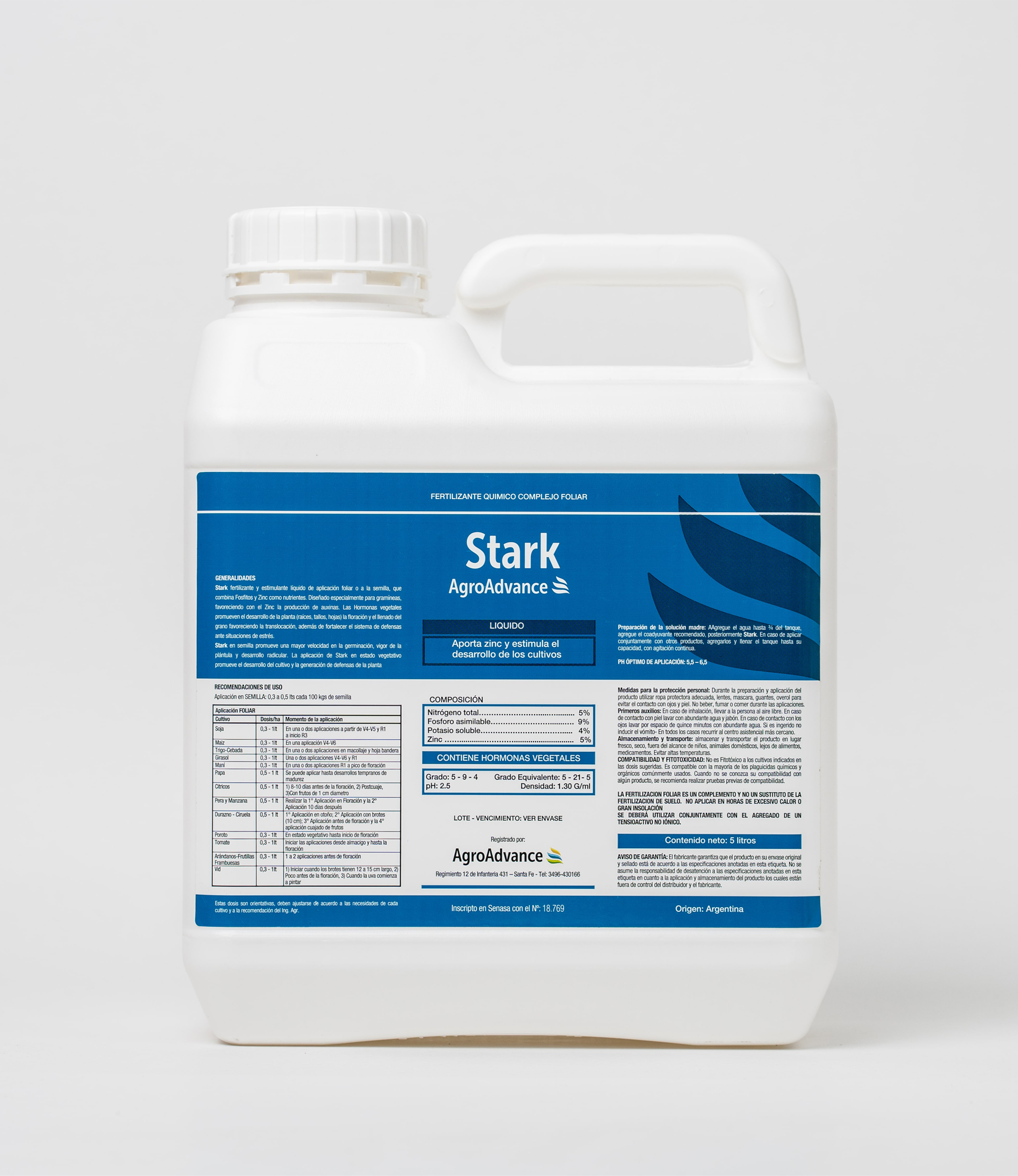 Stark es un fertilizante y fito estimulante líquido de aplicación foliar o a la semilla, que combina Fosfitos y Zinc como nutrientes. Diseñado especialmente para gramíneas, favoreciendo con el Zinc la producción de auxinas.